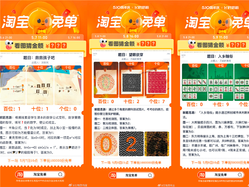 今年淘宝510周年庆在5月6日拉开序幕,淘宝冷启动上线了名为「淘宝免单」的猜题免单活动,悄悄将51元免单短信发送到了“押中题目答案”的用户手机里。不少用户以为是淘宝系统bug,在小红书、微博等社交媒体...