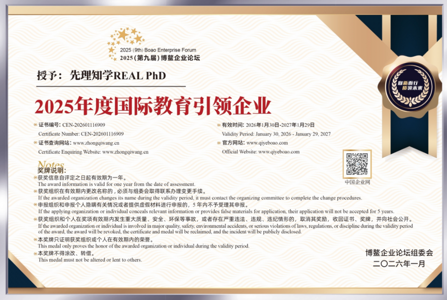 迄今为止,先理知学REAL PhD已助力逾万名学子圆梦博士。其专业实力亦获得了业界与媒体的广泛认可:央广网教育“2024年度影响力留学服务品牌”、福布斯中国“2025留学出国服务卓越品牌”、胡润“年度国际化教育影响力品牌”;在国际层面,由BOC Global主办的International Brilliance Awards及IE 100 Awards授予其“International Education Leadership Brand of The Year”称号;此外,品牌还获评博鳌“2025年度国际教育引领企业”。