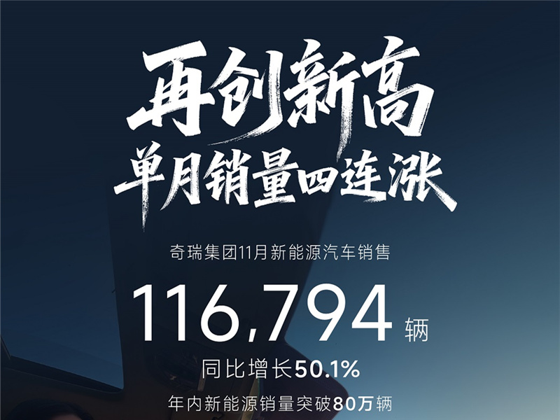 环比“四连涨”!奇瑞集团前11月新能源销量突破80万辆,同比增长69.4%