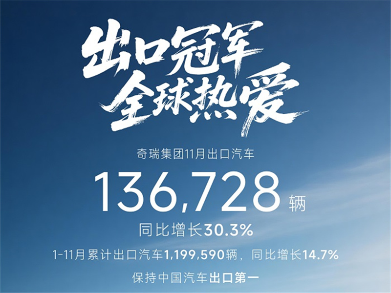 奇瑞集团11月出口13.7万辆,连续七个月突破10万辆,稳居中国汽车出口第一