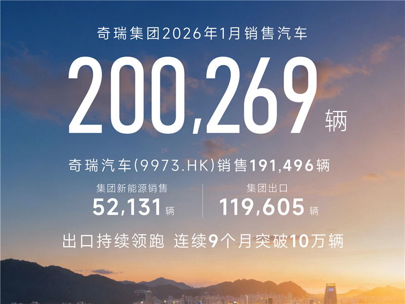 奇瑞集团1月销售汽车20万辆出口11.96万辆持续领跑 连续9个月突破10万辆